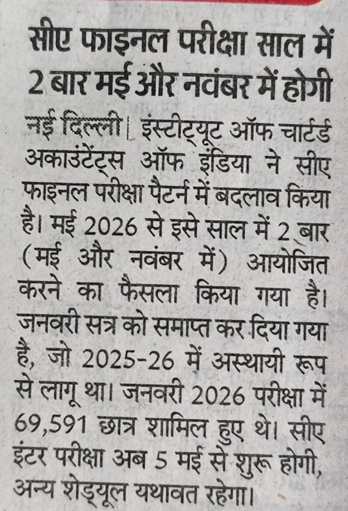 News सीए फाईनल परीक्षा साल में दो बार मई और नवम्बर में होगी BY cscbarkuhi@gmail.com April 10, 2026 0 Comments 3 Views