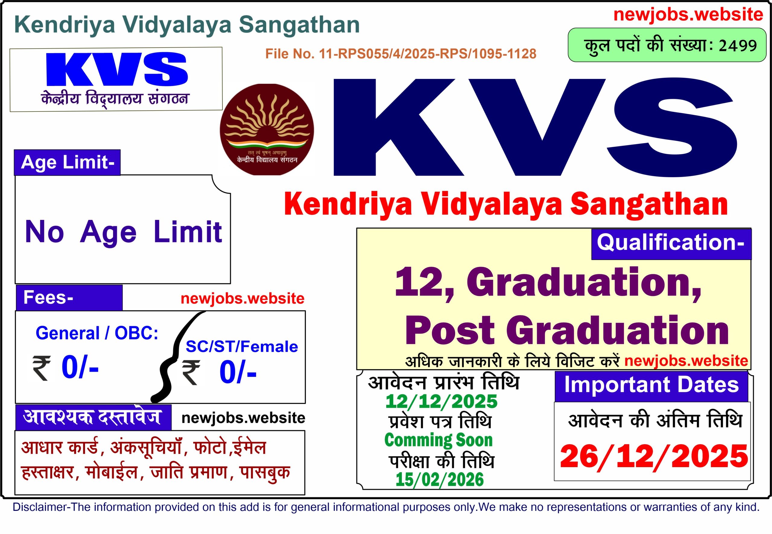 Description: Kendriya Vidyalaya Sangathan Recruitment 2026 ने एक Official Notification जारी किया है जिसमें Teach. & Non Teach आदि के पदों के लिये विज्ञापन जारी किया है. आवेदन की प्रक्रिया 12/12/2025 से प्रारंभ है व अंतिम तिथि 26/12/2025 है। इच्छुक आवेदक अपनी योग्यता आदि की जांच कर अंतिम तिथि से पूर्व आवेदन कर सकते हैं। File No.11-RPS055/4/2025-RPS| […]