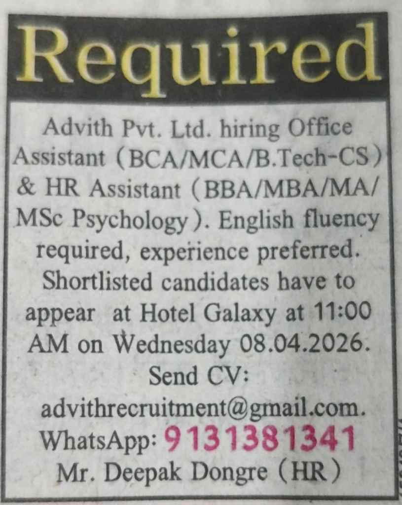 Private Jobs Advith Pvt. Ltd. hiring office Assistant & HR Assistant BY cscbarkuhi@gmail.com April 7, 2026 0 Comments 10 Views