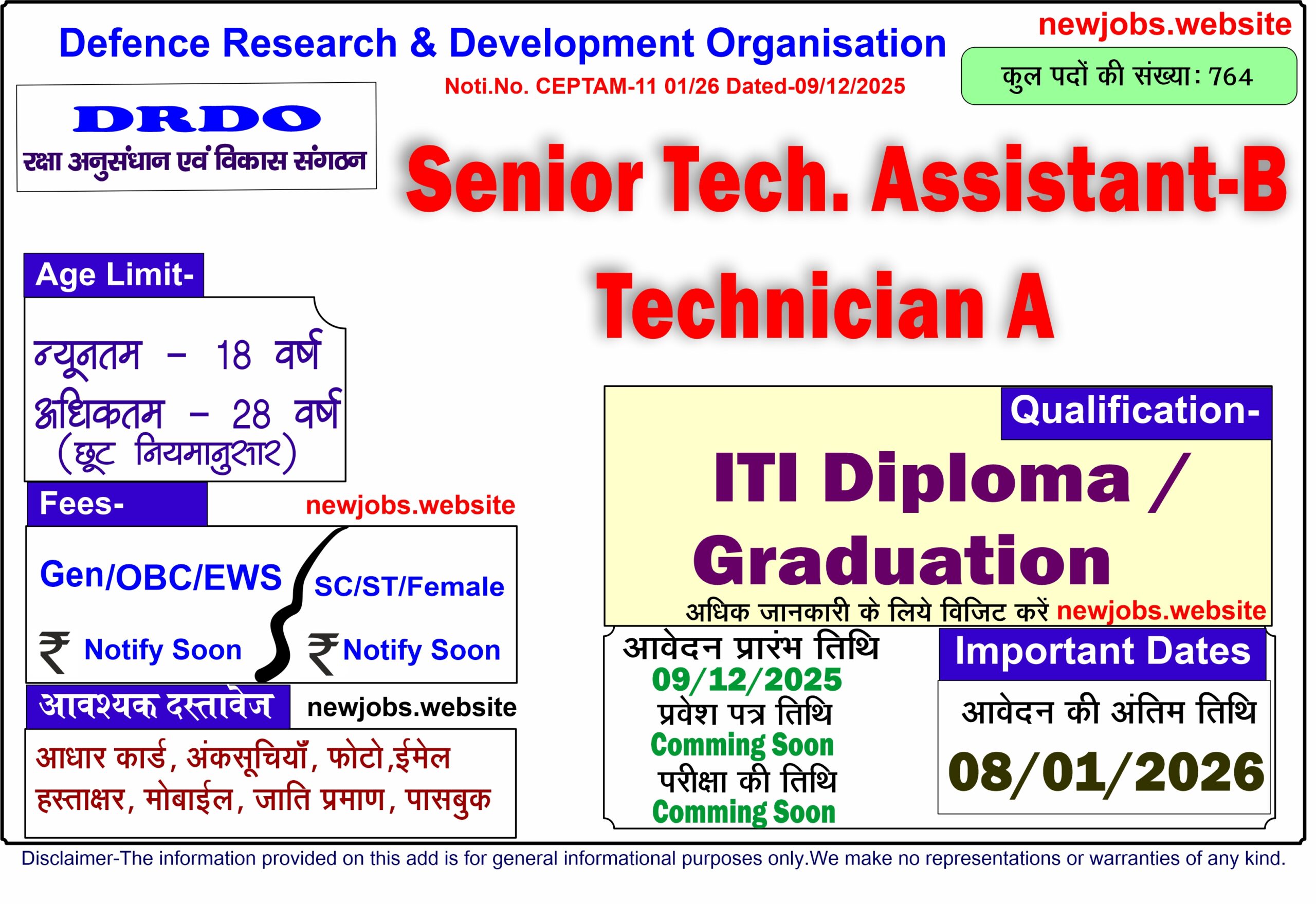 DRDO CEPTAM-11 Recruitment Apply Online for 764 STA-B & Tech-A...