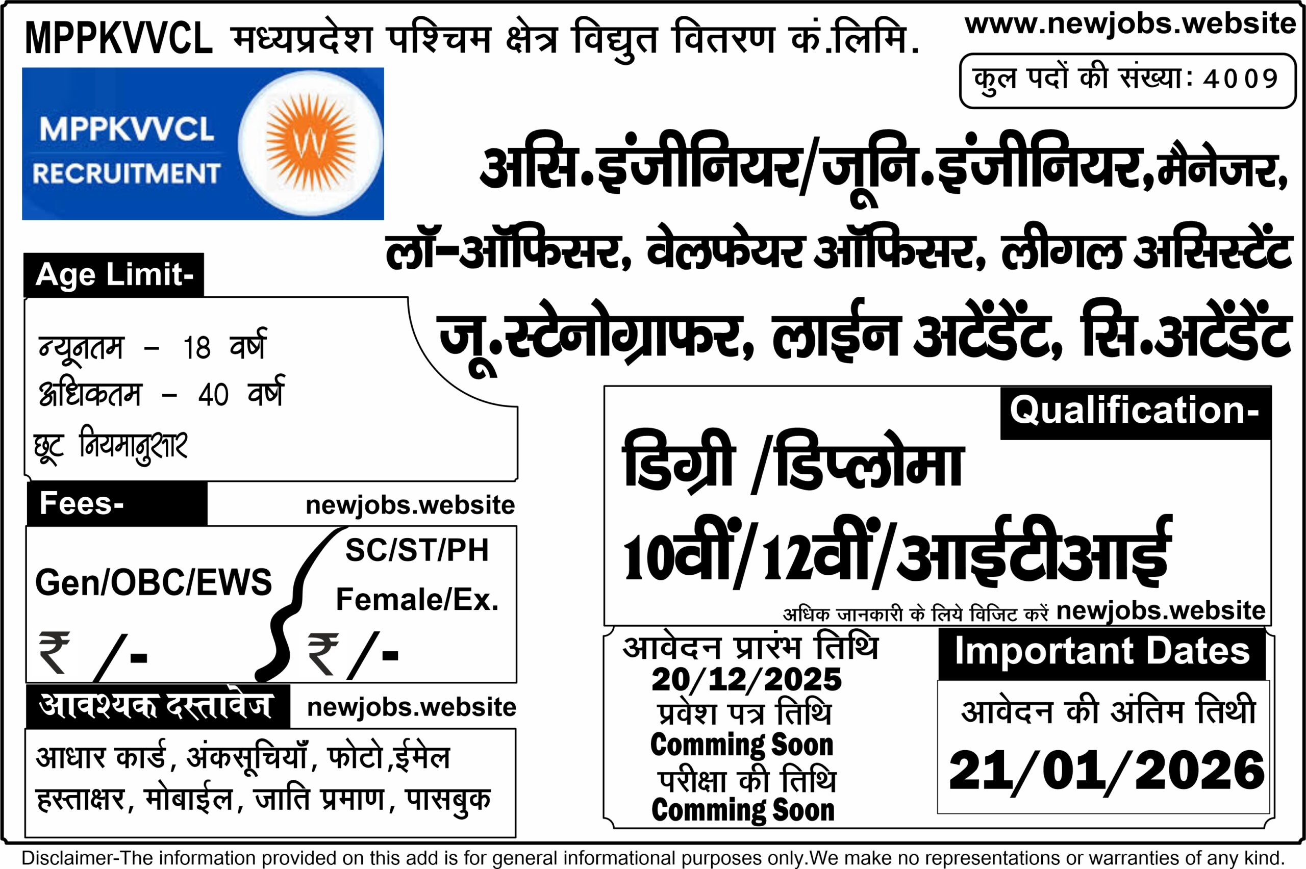 विवरण – Madhya Pradesh Paschim Kshetra Vidyut Vitran Company Limited (MPPKVVCL) ने AE, JE, Line Attendent Recruitment 2025 व अन्य पदों के लिए विज्ञापन जारी किया है। आवेदन की प्रक्रिया 20 दिसम्बर 2025 से 21 जनवरी 2026 तक जारी रहेगी । इच्छुक आवेदक आवेदन के पूर्व योग्यता आदि की जांच कर अंतिम तिथि के पूर्व आवेदन कर सकते है। आवेदक विस्तृत जानकारी के लिये नीचे दिये गये ऑफिशियन नोटिफिकेशन लिंक के माध्यम से विस्तृत जानकारी प्राप्त कर सकते हैं ।
