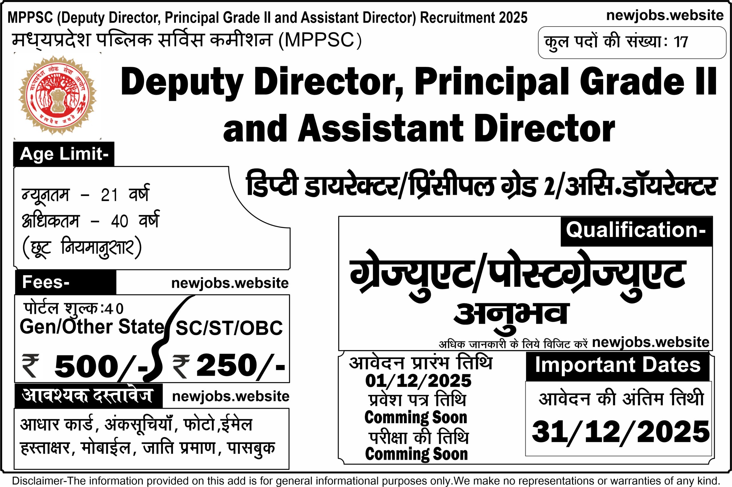 MPPSC (Deputy Director, Principal Grade II and Assistant Director) Recruitment 2025 Apply Online for 17 Post